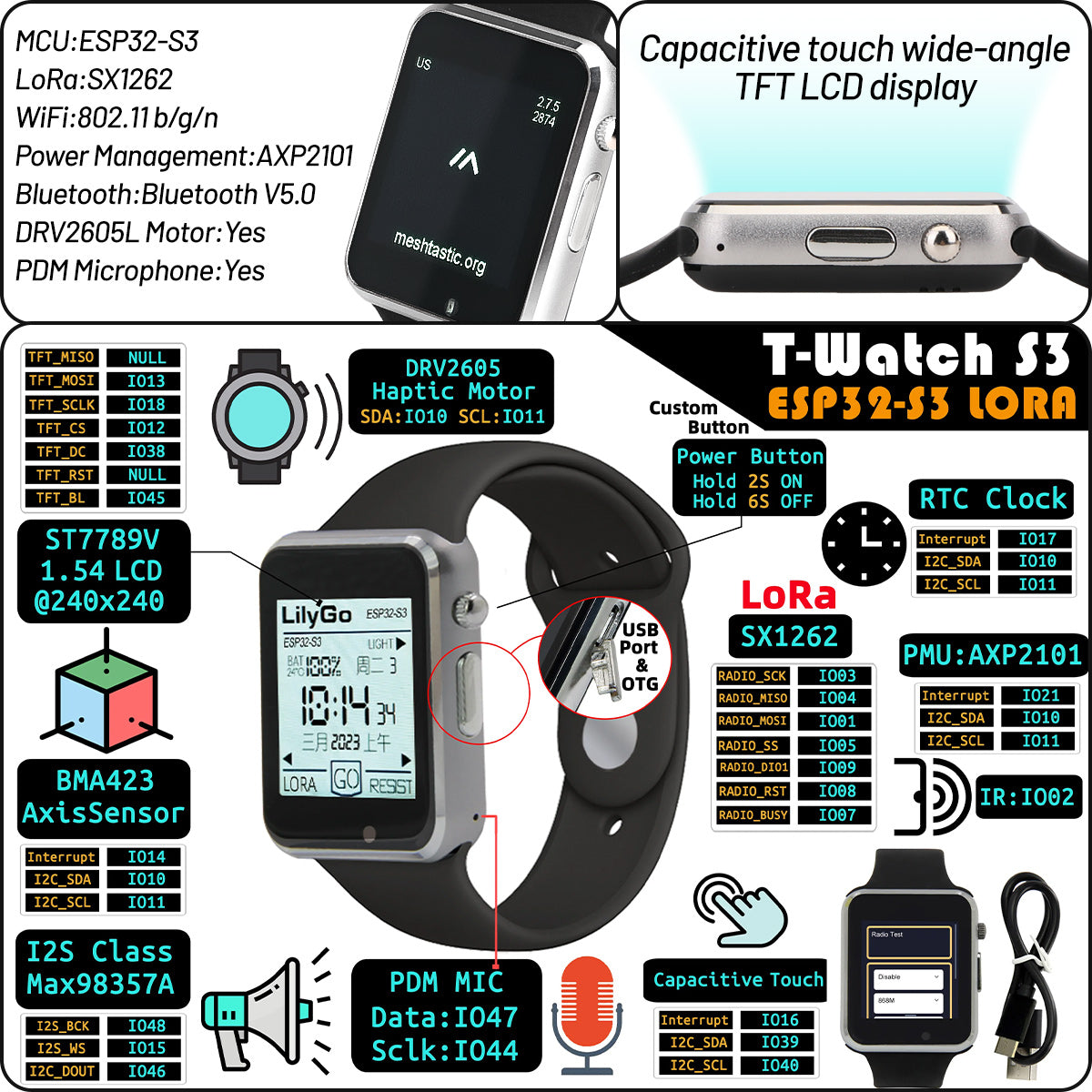 The LilyGo T Watch S3 is an advanced smartwatch that combines with ESP32 S3 WiFi Bluetooth and SX1262 LoRa Chip.Compatible Meshtastic and Meshcore firmware. Whether you're looking for fitness tracking, health monitoring, or a reliable communication tool, this smartwatch has it all. Seamlessly connect with your outdoor gear and enjoy reliable off-grid messaging via Meshtastic,perfect to using as a Meshtastic/Meshcore Mesh Watch, making it the perfect choice for adventurers, outdoor enthusiasts, and tech-savvy users.