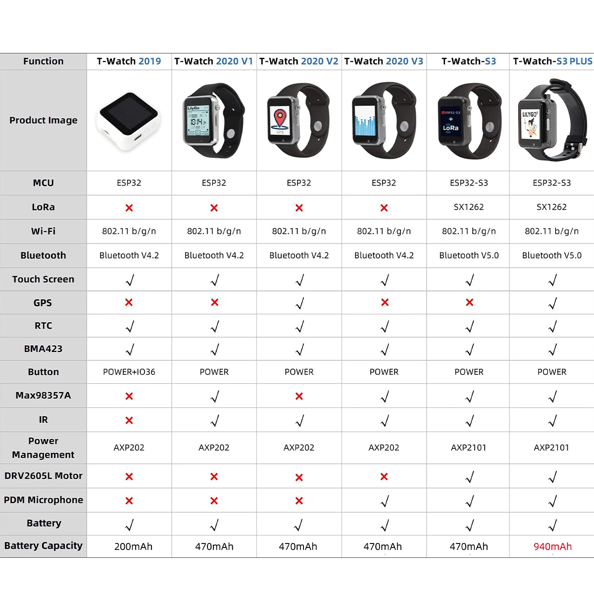 | Model | T Watch S3 | T Watch S3 Plus |